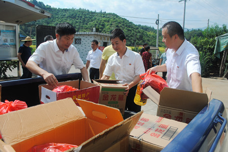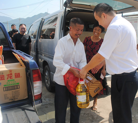 圖為臺州收費(fèi)所黨支部書記王小勇給困難戶送上慰問品 潘山頭村共有22戶困難戶,因時間關(guān)系,臺州收費(fèi)所黨支部一行走訪了其中3戶困難家庭,對于其他19戶困難家庭委托該村“兩委”領(lǐng)導(dǎo)代為慰問。每到一戶,支部書記王小勇都詳細(xì)詢問了解困難群眾的生活情況,勉勵他們積極面對生活,戰(zhàn)勝困難,同時為他們送去了中秋月餅、食用油、干果等慰問品及節(jié)日問候。