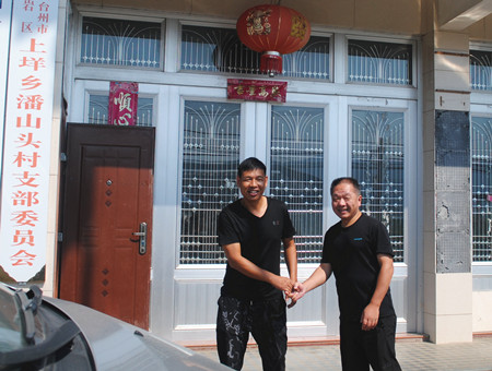 圖為公司黨群部負(fù)責(zé)人邵克與潘山頭村村長親切握手
