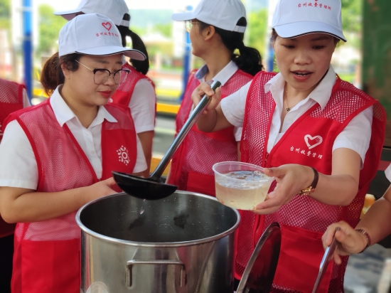 上午9點(diǎn),志愿者們身著統(tǒng)一紅馬甲,在崗?fù)さ陌踩珝u上設(shè)立服務(wù)臺(tái),抬出食堂提前制作好的青草糊、綠豆湯等清涼飲品。你來(lái)分杯我來(lái)送,大家不亦樂(lè)乎開(kāi)始了送清涼活動(dòng)。