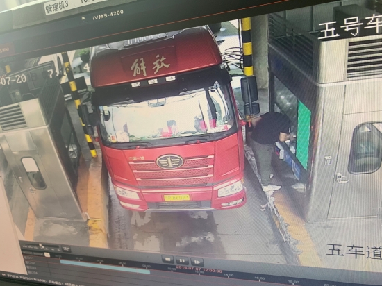 圖為失主遺落錢財(cái)現(xiàn)場 當(dāng)天上午,收費(fèi)班長李寧巡查時(shí)在第五車道窗口附近發(fā)現(xiàn)了三百元現(xiàn)金,經(jīng)多方確定不是所內(nèi)工作人員遺失后,判斷為過往司機(jī)不小心遺失。為了盡快找到失主,李寧隨即去監(jiān)控室調(diào)取視頻查找。 經(jīng)過監(jiān)控查找,馬上鎖定了一輛車牌為“豫”字開頭的大貨車。原來當(dāng)時(shí)因駕駛室距離窗口較遠(yuǎn),司機(jī)下車付錢,監(jiān)控中清晰顯示司機(jī)在掏錢繳費(fèi)時(shí)三百塊現(xiàn)金從口袋里掉到車道上,但是司機(jī)因?yàn)橼s路絲毫沒有發(fā)覺。確認(rèn)失主后,工作人員查詢司機(jī)電話并取得聯(lián)系,告知其遺失三百現(xiàn)金,在通過微信確認(rèn)身份后,李寧將錢轉(zhuǎn)給了司機(jī)。