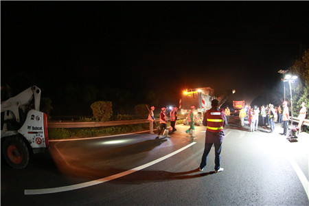 反復溝通,施工保質保進度。要在車流量極大的主干線上夜間順利施工,不僅對工程質量、進度負責,更要對安全保暢負責,不能有半點疏忽,不允許絲毫麻痹,而且涉及面極廣。不僅涉及工程部與施工監理單位,更涉及到高速交警、路政及運營管理等多個部門,前期工程部協交警、營運部、監理、施工等各相關單位就施工方案反復論證,一次次的討論與交流,計劃改了又改,從提前發布公告到路口設立標志,從預警車輛安排到分流時間節點,從搶險預案到應急小分隊建立,路面的反復測量,綠化養護的同期推進.....千頭萬緒,在于每一個細節的反復論證。一直到11號下午,確定了最合理有效的交通組織方案,施工前的安全和技術方面有了最后的交底,器械設備、材料、人員班組配備等一一清點得到最終確認。
