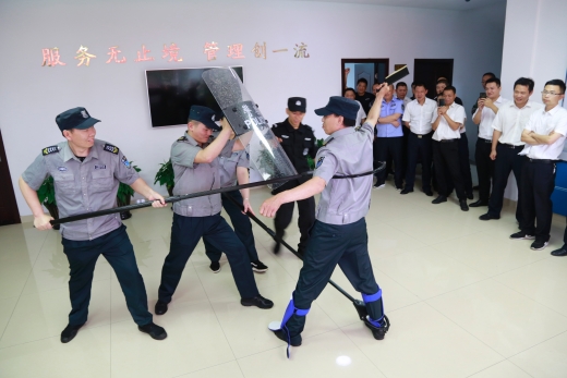 圖為物業人員現場練習器械使用 演練開始前,盧尚明對防爆盾牌、防爆鋼叉、抓捕器、警棍等各類防爆器材的功能和使用方法進行一一講解,并示范操作,以及帶領大樓浙師大印象物業人員現場練習器械使用。