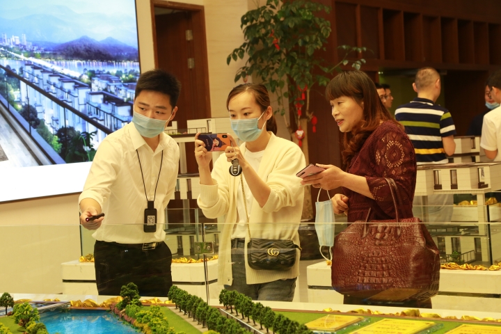 圖為陳文波對照圖紙了解樓盤情況 在銷售展廳樓盤沙盤前,陳文波聽取了高速房產(chǎn)(集團(tuán))公司負(fù)責(zé)人關(guān)于玖璽逸墅項(xiàng)目銷售計(jì)劃、認(rèn)籌客戶等情況匯報(bào)。他對前期房產(chǎn)公司的辛苦付出給予充分肯定,要求大家認(rèn)真服務(wù)好每一個(gè)來訪客戶,彰顯出國企品質(zhì),全力做好銷售工作。 當(dāng)天,銷售展廳樓內(nèi),陸陸續(xù)續(xù)有客戶進(jìn)出,“我很早就看中這個(gè)樓盤了,不僅位置好,而且采光好、通風(fēng)好,居住在這里一定非常舒服。”一名準(zhǔn)客戶張女士夸贊道,今天她特意前來交付認(rèn)籌金。  圖為客戶在疊墅沙盤前參觀