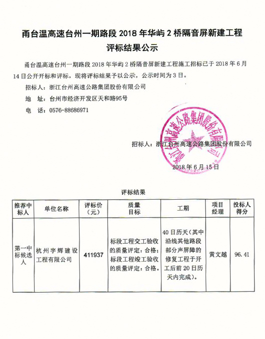 甬臺溫高速臺州一期路段2018年華峪2橋隔音屏新建工程評標結果公示