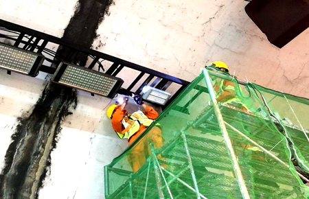 圖為施工人員拆除原排燈橋架