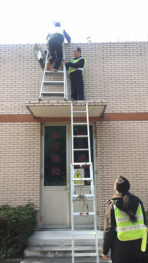 圖為執(zhí)勤人員清理屋頂雜草和塵土