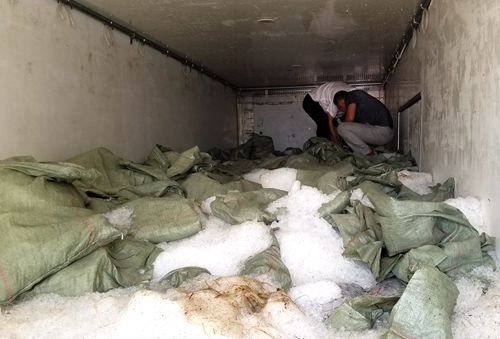 李貴陽(yáng)打開(kāi)車(chē)輛后廂門(mén),迎面撲來(lái)一陣?yán)滹L(fēng),一眼望去車(chē)廂里面全部是一袋袋的花蛤,上面還壓著袋裝的冰塊和零碎的碎冰,車(chē)廂內(nèi)部看不清楚。憑借多年的工作經(jīng)驗(yàn)和認(rèn)真負(fù)責(zé)的工作態(tài)度,李貴陽(yáng)二話(huà)沒(méi)說(shuō),直接爬上濕滑的車(chē)廂,踏過(guò)冰袋和碎冰,深入到車(chē)廂里面去檢查,把冰袋掀開(kāi)后,結(jié)果發(fā)現(xiàn)下面全部是空桶。原來(lái)這樣做既可以增加貨物面積也可以使重量加重,從而達(dá)到綠農(nóng)政策的免費(fèi)通行要求。