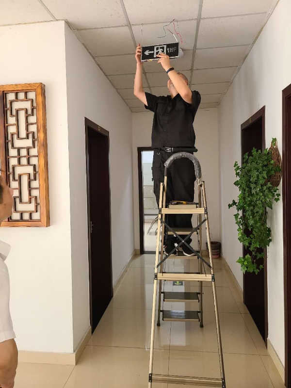 圖為技術(shù)人員安裝現(xiàn)場 在得知這一情況后,維養(yǎng)中心積極協(xié)助收費站所購買相關(guān)的主材及配件,并主動承擔(dān)了這些設(shè)備安裝工作。由于設(shè)備安裝位置很多沒有直接可用電源,中心技術(shù)員們就從四五米外甚至更遠的地方,一路套管放線過來取電,并用電錘等工具為其開孔固定,最后再完成接線送電。經(jīng)過2天努力,這些帶有方向提示標(biāo)識、安全出口標(biāo)識的燈牌被安裝在各層樓梯出口、拐角或主要通道上,因全部帶有儲電功能,即便在斷電的情況下也能發(fā)光發(fā)亮。