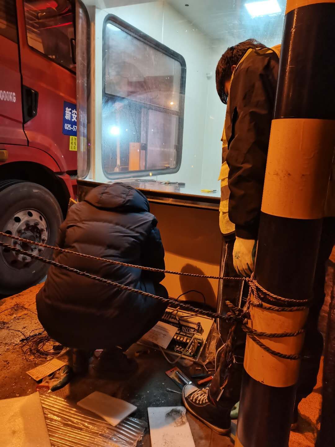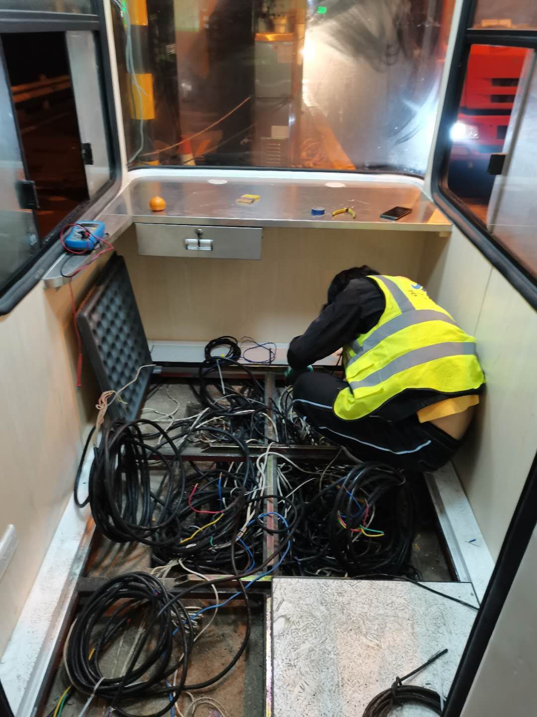21日下午4點(diǎn)左右,訂購的新崗?fù)ず蛽p壞的設(shè)備設(shè)施陸續(xù)到位,中心值班人員協(xié)同設(shè)備廠家一起將其安放并固定至車道原位置。因崗?fù)A倒時(shí)拉斷了底下很多線纜,在拆除設(shè)備時(shí)又因?yàn)榫o急搶修需要沒有作相應(yīng)標(biāo)注,現(xiàn)場各種電線接頭雜亂如麻。考慮到夜間查線、接線存在一定安全隱患也不利于施工,搶修人員決定第二天再戰(zhàn)。