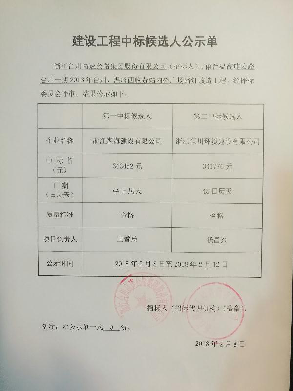 2018年臺州、溫嶺西收費站內(nèi)外廣場路燈改造工程中標候選人公示單