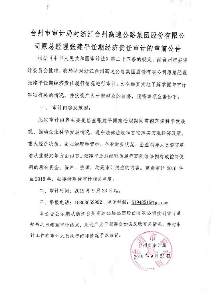 臺(tái)州市審計(jì)局對(duì)浙江臺(tái)州高速公路集團(tuán)股份有限公司原總經(jīng)理張建平任期經(jīng)濟(jì)責(zé)任審計(jì)的審前公告