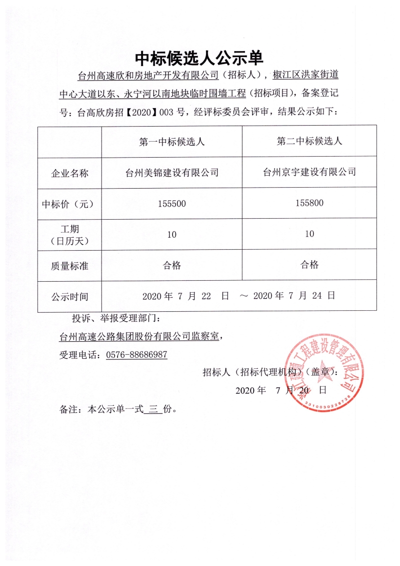 椒江區洪家街道中心大道以東、永寧河以南地塊臨時圍墻工程(招標項目)中標候選人公示單