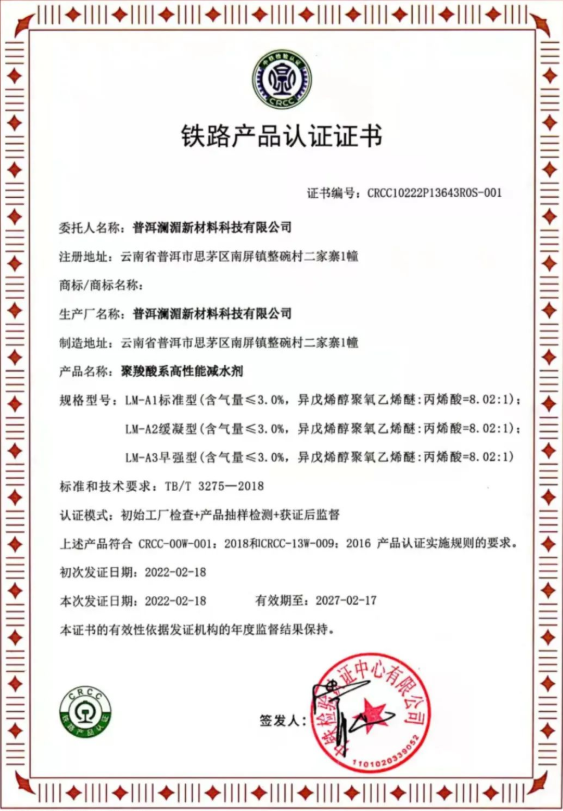 普洱瀾湄新材料科技有限公司于2021年12月順利通過(guò)中鐵檢驗(yàn)中心認(rèn)證,并于2022年2月18日頒發(fā)了CRCC“鐵路產(chǎn)品認(rèn)證證書”。該項(xiàng)證書標(biāo)志著我公司鐵路用聚羧酸系高性能減水劑系列產(chǎn)品已達(dá)到國(guó)家、行業(yè)高標(biāo)準(zhǔn)的要求,為公司進(jìn)一步深入鐵路等國(guó)家基建項(xiàng)目建設(shè)打下堅(jiān)實(shí)基礎(chǔ)。